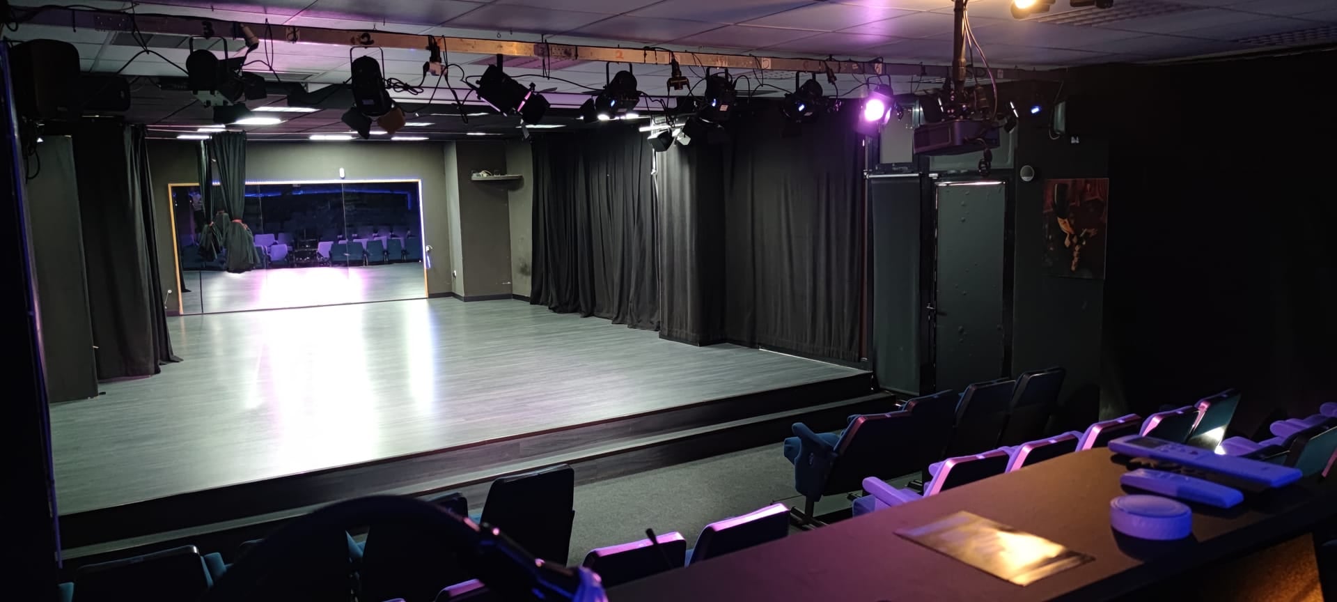 Sala íntima con butacas, escenario y distancia corta entre público y acción. Perfecta para grupos reducidos que buscan una experiencia cercana.